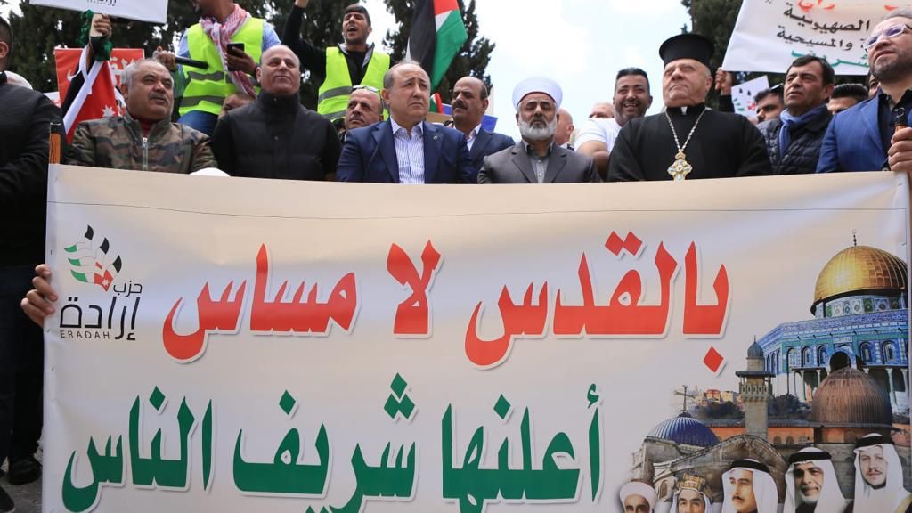 وأكدوا أن قضية القدس قضية عقدية والاقصى معركة أمة وكرامة والوصاية الهاشمية حق وسنبقى في الأردن شوكة في حلق إسرائيل ونقاوم خلف قيادة جلالة الملك عبدالله الثاني تجاه فلسطين والمقدسات.