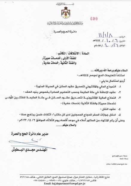 عممت وزارة الأوقاف والشؤون والمقدسات الإسلامية على مكاتب الحج والعمرة والائتلافات، ضرورة الانتهاء من إدخال الحجوزات على النظام الإلكتروني في موعد أقصاه يوم الثلاثاء الموافق 2 / 5 / 2023، ليتم إصدار تأشيرة الحج .