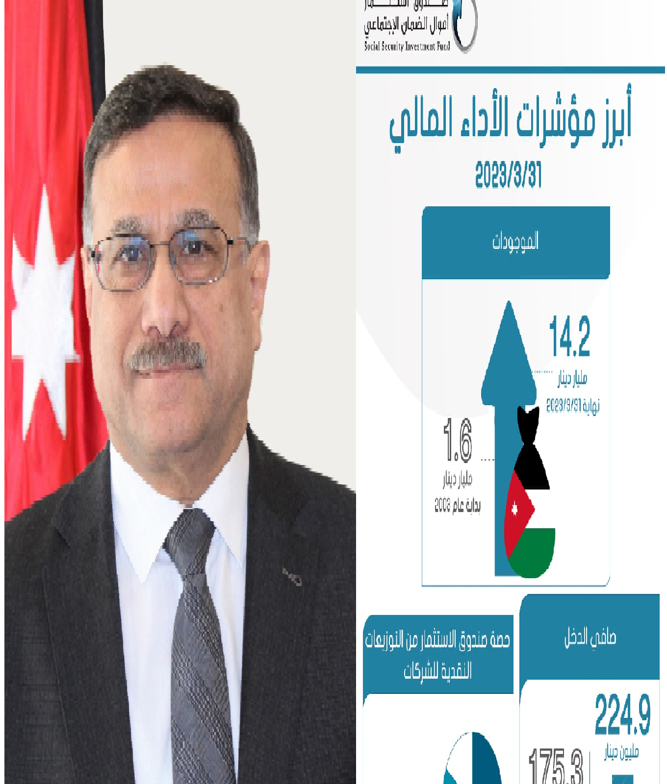 ارتفعت موجودات صندوق استثمار اموال الضمان الاجتماعي لتصل الى حوالي 14.2 مليار دينار نهاية الربع الأول من عام 2023، مقارنة مع 13.8 مليار دينار نهاية عام 2022.