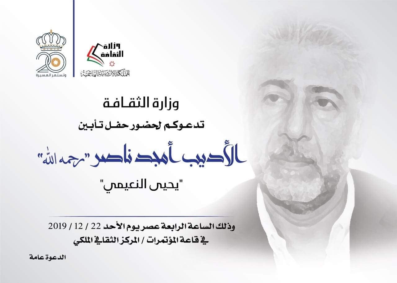 وزارة الثقافة تقيم حفل تأبين للأديب الكبير الراحل أمجد ناصر حيثُ سيكون اليوم الأحد في تمام الساعة الرابعة من عصراً ، في المركز الثقافي الملكي، ويُعد الراحل من أهم رموز الحداثة الشعرية بما في ذلك القصيدة النثريه ، ونتاجه الإبداعي ساهم في إثراء المشهد الشعري العربي، من خلال مؤلفاته الشعرية، وايضا من خلال مشاركاته المتعددة في المهرجانات العربية والدولية.