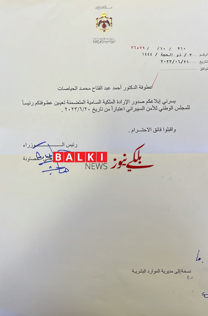 صدرت الإرادة الملكية السامية اليوم بتعيين الدكتور أحمد عبدالفتاح محمد الحياصات رئيسا للمجلس الوطني للأمن السيبراني اعتبارا من 20-6-2023.