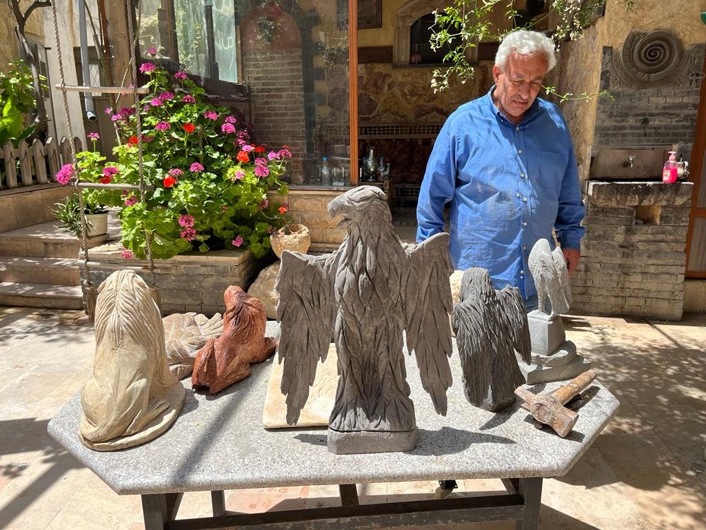 وختم حديثه بأن الأدوات المستخدمة معروفة لدى النحاتين بـ"منقار وأزاميل وشواكيش ومطرقة"، معرّفا أسلوبه بالنحت بأنه "نفر وحفر".