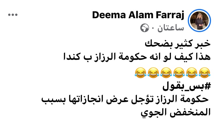 نشرت الناشطة الاعلامية ديما علم فراج على صفحتها الرسمية على فيس بوك تهكم وسخرية على خبر تأجيل عرض إنجازات الحكومة غدا بسبب تأثر المملكة بمنخفض جوي عميق .