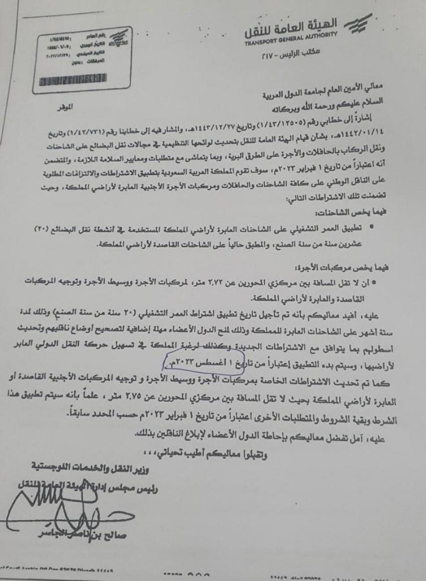 يدخل قرار المملكة العربية السعودية بشأن تطبيق العمر التشغيلي على الشاحنات الأردنية العابرة للأراضي السعودية والتي يتجاوز عمرها 20 عاما من سنة الصنع، حيز التنفيذ اعتبارا من يوم غد الثلاثاء الموافق 2023/8/1.