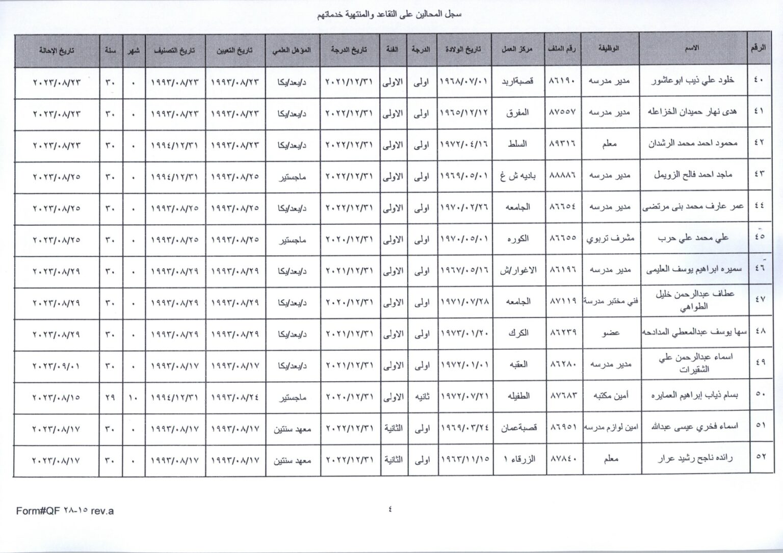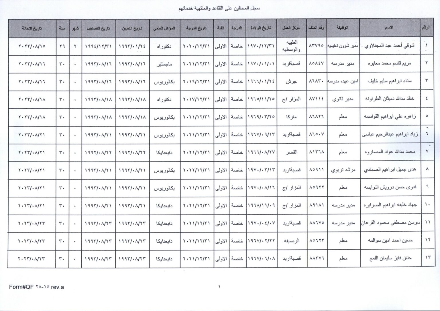 قرر مجلس الوزراء إحالة موظفين من ملاك وزارة التربية والتعليم على التقاعد ابتداء من صباح التاريخ المبين إزاء اسم كل منهم وفق الجدول المرفق.
