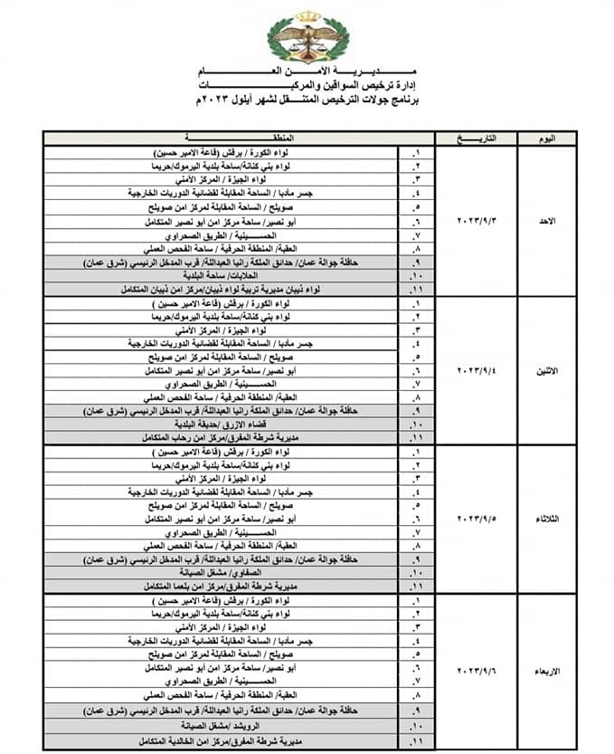 أعلنت إدارة ترخيص السواقين والمركبات مواعيد العمل بجولات الترخيص المتنقل ضمن المبادرة الابتكارية (بنوصلك) خلال شهر أيلول/ سبتمبر لعام 2023 في عدد من مناطق المملكة. وبحسب الإعلان، ستكون ساعات الدوام للترخيص المتنقل من يوم الأحد ولغاية يوم الأربعاء من الساعة 8:00 صباحاً وحتى الساعة 2:00 ظهراً، ويوم الخميس من الساعة 8:00 صباحاً ولغاية الساعة 1:00 ظهراً.