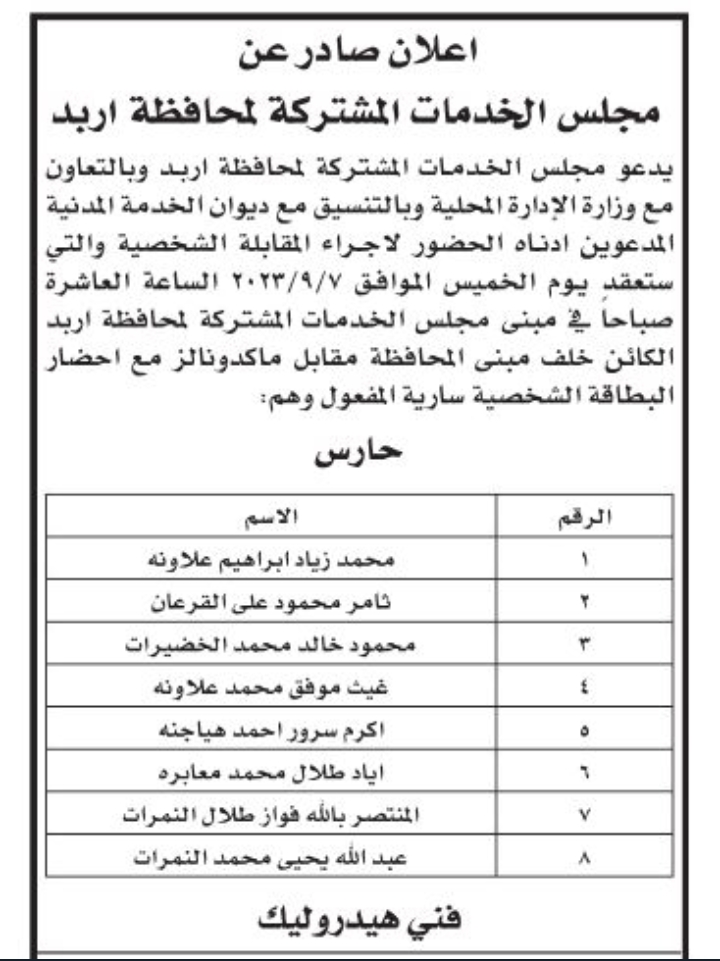 دعت عدداً من المؤسسات الرسمية والبلديات بالتنسيق مع ديوان الخدمة المدنية اليوم الأحد، مرشحين لإجراء المقابلات الشخصية .