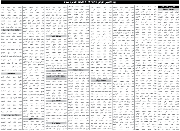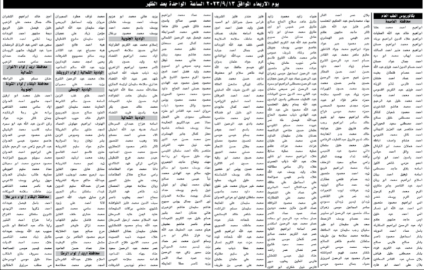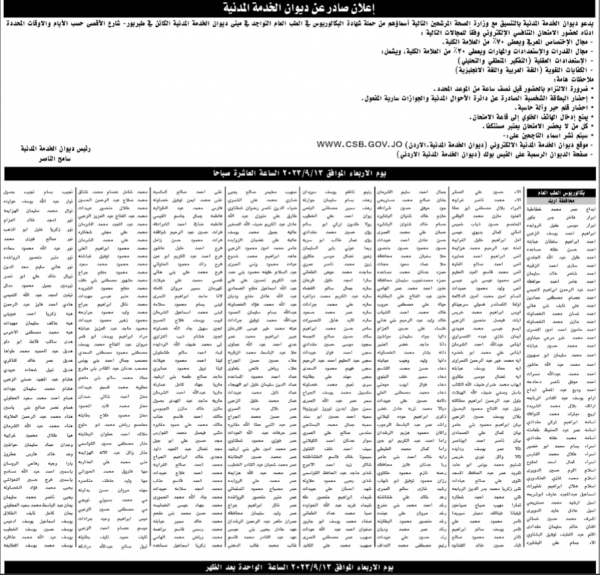وطلبت الوزارة من المرشحين بضرورة الإلتزام بالحضور قبل نصف ساعة من الموعد المحدد ،وإحضار البطاقة الشخصية الصادرة عن الأحوال المدنية والجوازات سارية المفعول ،وإحضار قلم حبر وآلة حاسبة . وأكدت الوزارة بأن كل من لايحضر الإمتحان يعتبر مستنكفاً منوهه بأنه سيتم نشر أسماء الناجحين على موقع ديوان الخدمة المدنية الإلكتروني WWW.CSB.GOV.JO وتاليا الاسماء :