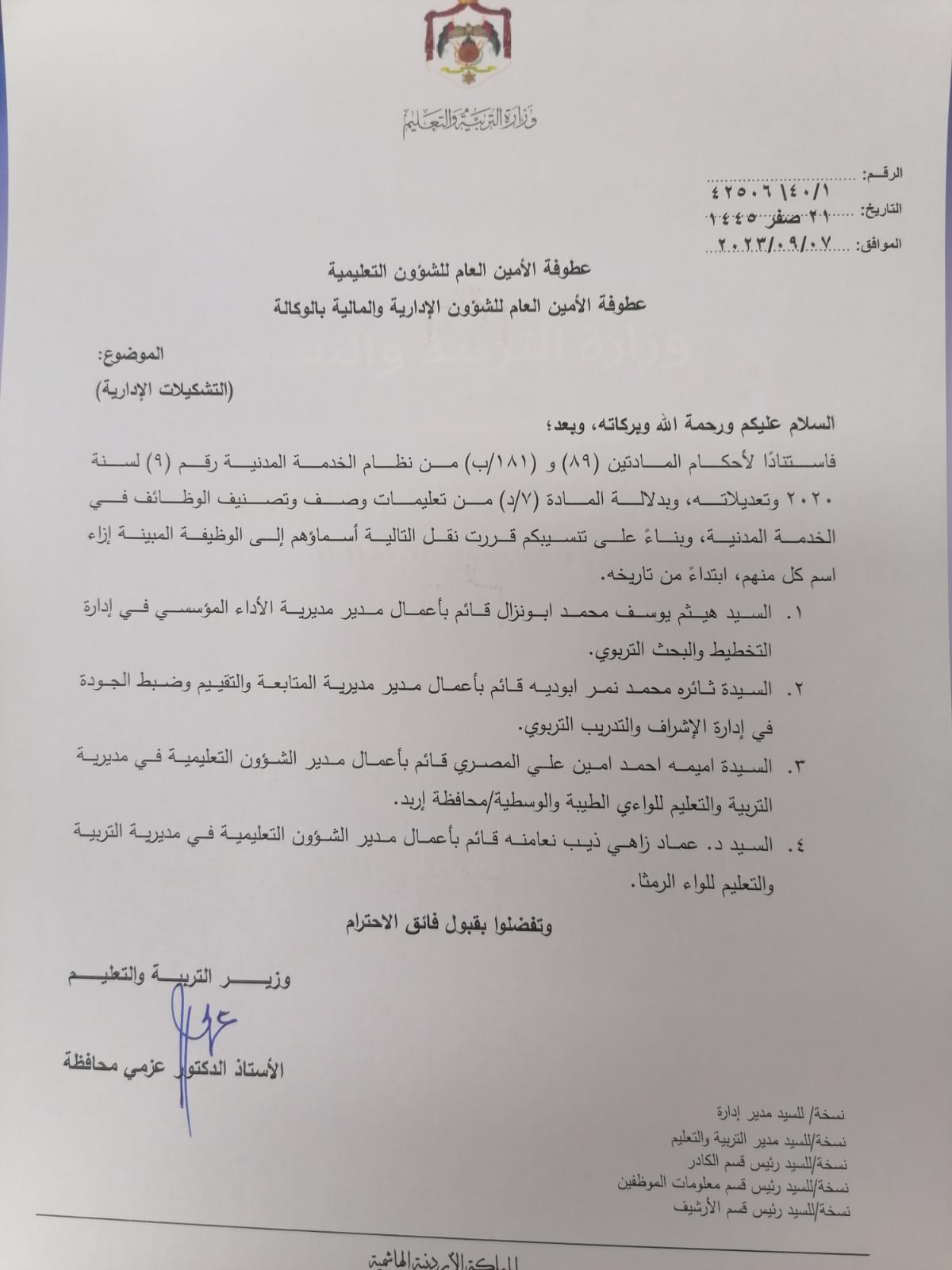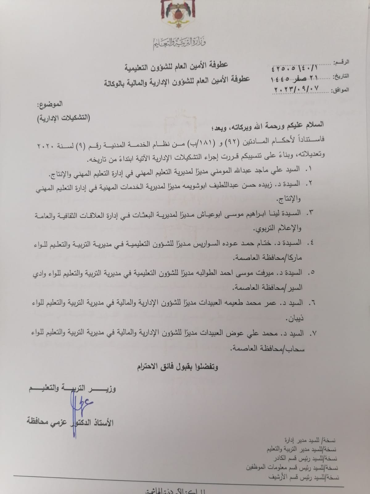 قرر وزير التربية والتعليم الدكتور عزمي محافظة الموافقة على تتسبب الأمين العام للشؤون التعليمية والأمين العام للشؤون الادارية والمالية بالوكالة بإجراء التشكيلات الإدارية التالية في الوزارة :