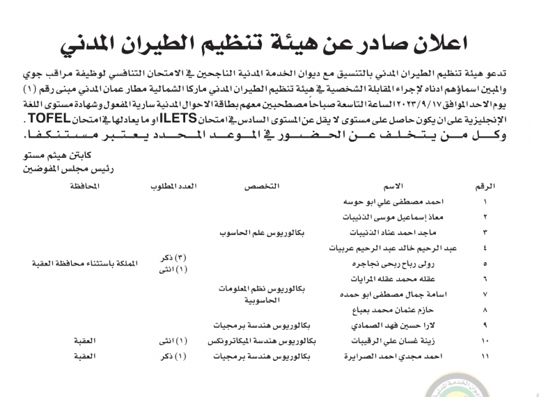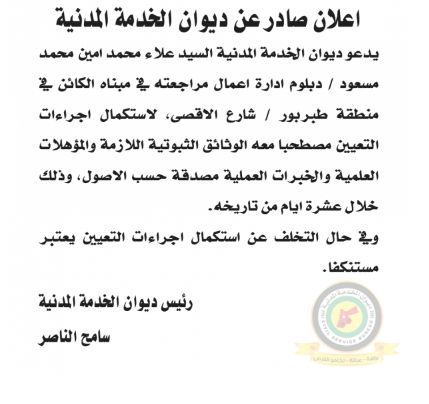 دعا ديوان الخدمة المدنية ، مرشحين للتعيين لاستكمال اجراءات التعيين .وحدد الموعد والمكان لمقابلات شخصية .التفاصيل والأسماء :