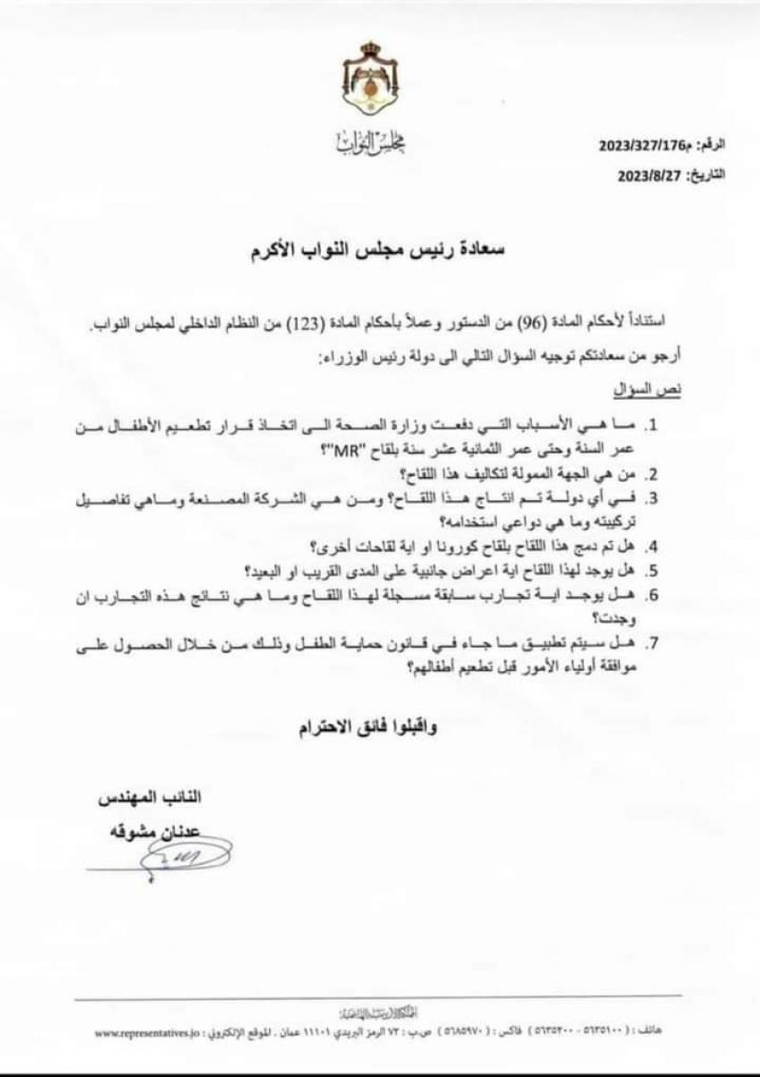 وأكد مشوقة انه تشاور بخصوص لقاح "MR" مع عدد من المختصين في المجال الطبي والذين بدورهم لم ينصحوا بالسماح بهذا اللقاح حيث انه تجريبي ويدخل الاردن لأول مرة وهناك شبهة بخلطه مع لقاح آخر ، ويجب إجراء فحوصات كافية ووافية للتأكد من سلامته على صحة اطفالنا. وتاليا نص أسئلة النائب مشوقة:
