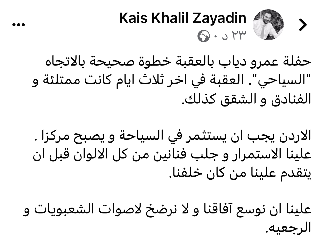 قال النائب السابق قيس زيادين إن حفلة عمرو دياب بالعقبة خطوة صحيحة بالاتجاه “السياحي”.