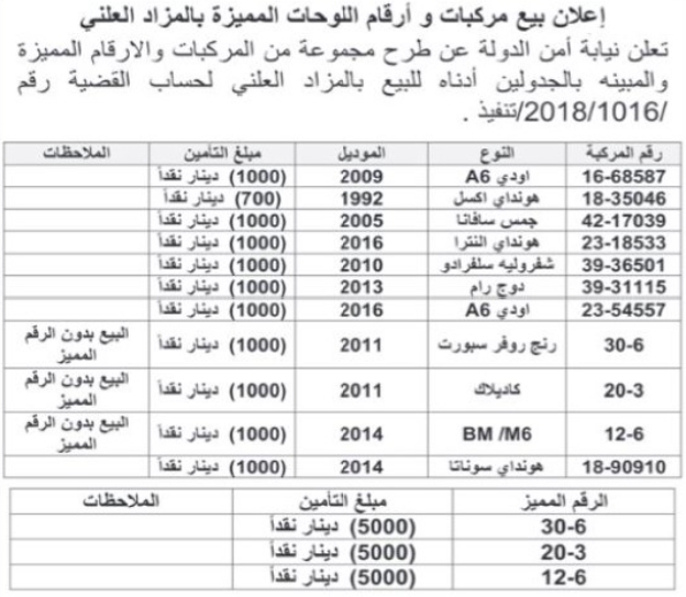 وقالت أمن الدولة إنه على الراغبين بالمشاركة بالمزاد العلني الحضور إلى إدارة ترخيص السواقين والمركبات ماركا الشمالية قاعة (اللواء المرحوم كريم أوهان) الاثنين المقبل، الساعة 10:30 صباحاً مصطحبين معهم مبلغ التأمين نقداً.