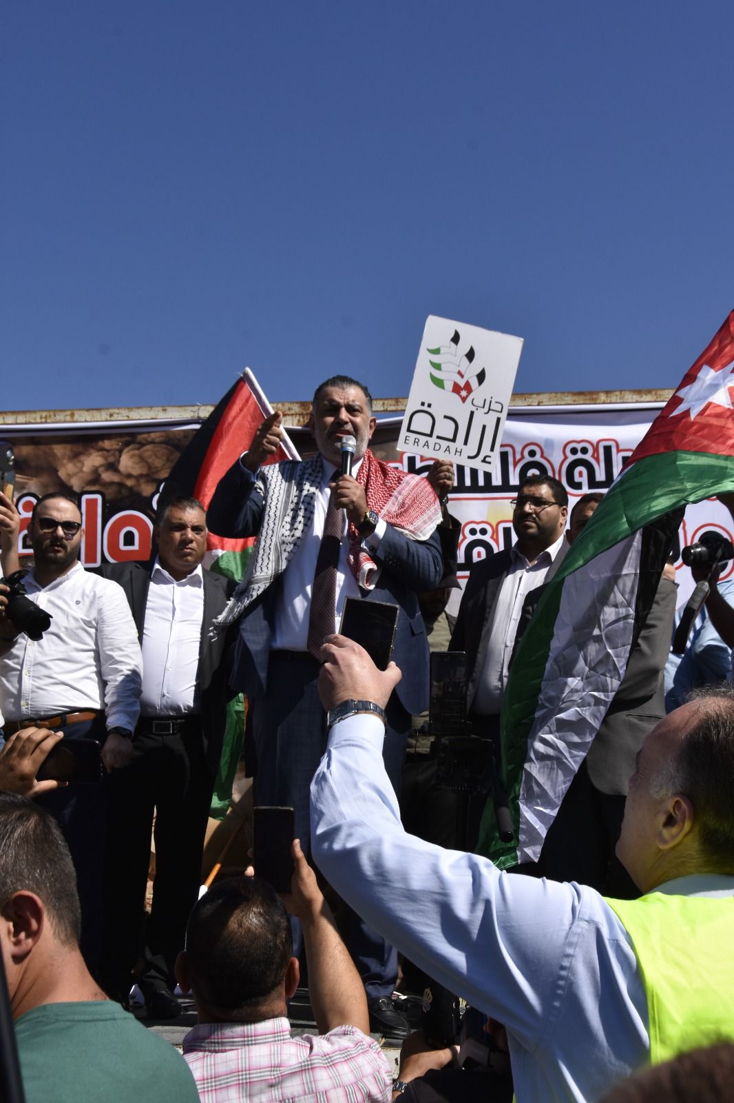 وقدم عضو المجلس المركزي في حزب إرادة الأمين العام لحزب إرادة نضال البطاينة، حيث قال البطاينة أن شعبنا الاردني الواحد في ارض الرباط ارض العزة والكرامة يعلنونها مدوية لا تنازل ولا تراجع عن الحقوق ولا تهاون مع عدو غاشم محتل، فكلنا فلسطينيون اليوم لأننا كلنا في الأردن أردنيون عندما يتعلق الشأن في الأردن وفلسطينيون عندما يتعلق الشأن بفلسطين واليوم البوصلة فلسطين.