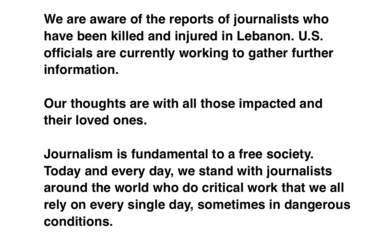 قال مصدر من الخارجية الأمريكية بتصريح خاص لبلكي نيوز : نحن على علم بتقارير الصحفيين الذين قتلوا وجرحوا في لبنان. ويعمل المسؤولون الأمريكيون حاليًا على جمع المزيد من المعلومات حول الحادث .