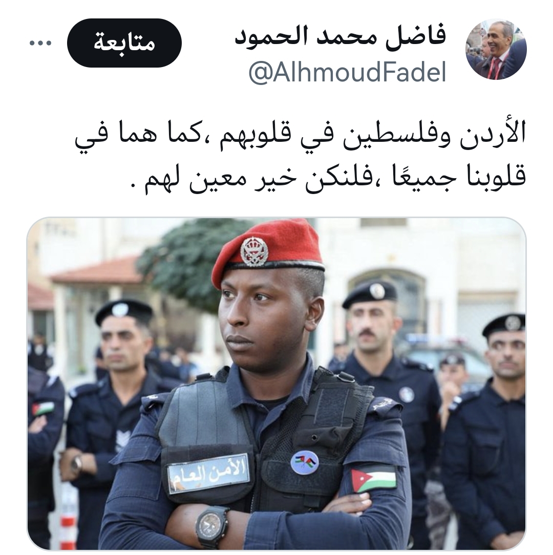 العين"فاضل الحمود ".. يغرد: الأردن وفلسطين في قلوبهم ،كما هما في قلوبنا جميعًا ،فلنكن خير معين لهم .