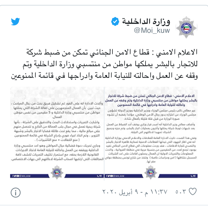 أعلنت أجهزة الأمن الكويتية أمس الخميس عن ضبط شركة تابعة لمسؤول في وزارة الداخلية بعد الكشف عن تورطها في عمليات اتجار بالبشر.وأكدت الوزارة في بيان لها أنها تلقت معلومات تفيد بوجود تجمع لعدد من المقيمين من جنسية عربية في منطقة الفروانية، أكدت المعلومات والتحريات الأولية أن هؤلاء عمال يحملون إقامات على إحدى الشركات المختصة حسب البيانات الرسمية بالأمن والحراسات الخاصة.وكشف المحققون أن العمال المتجمهرين على كفالة الشركة التي يملكها مواطن من منتسبي وزارة الداخلية وخمسة مقيمين من نفس موطن العمال، وتبين أن هذه الشركة الربحية تعمل على جلب العمالة من الخارج وتتحصل منهم على مبالغ مالية، مما يقع تحت طائلة قضايا الاتجار بالبشر وشبهة التزوير حسب قوانين البلاد.