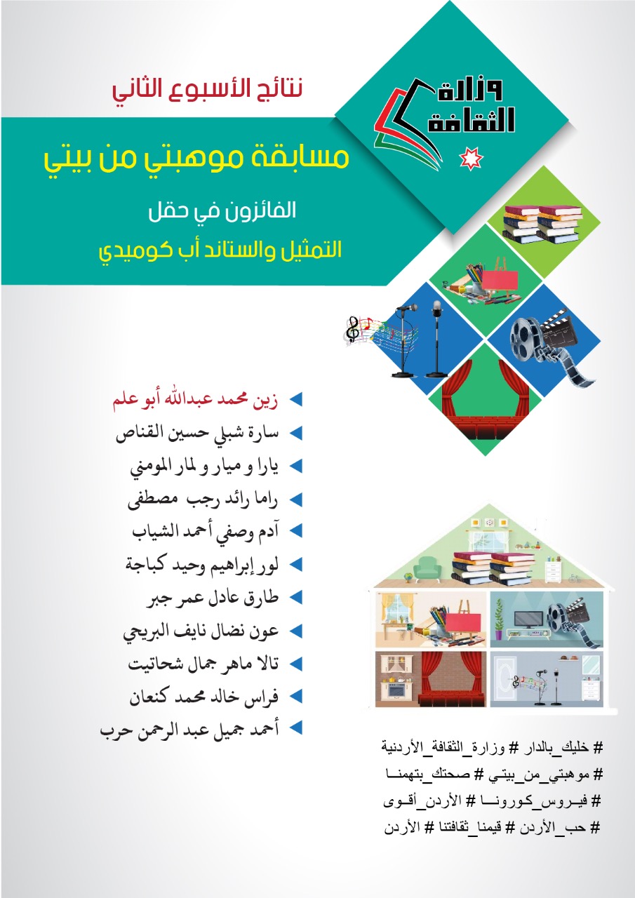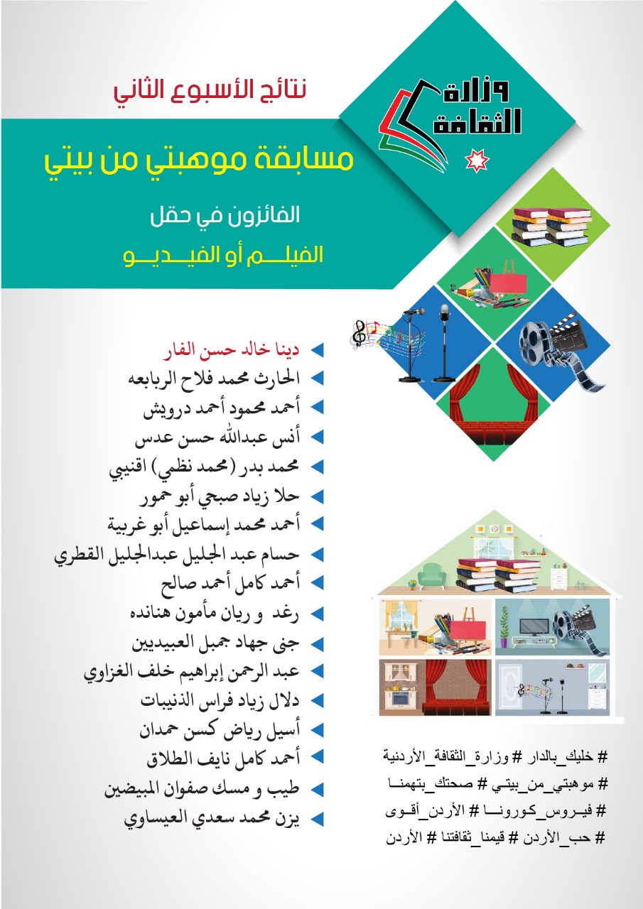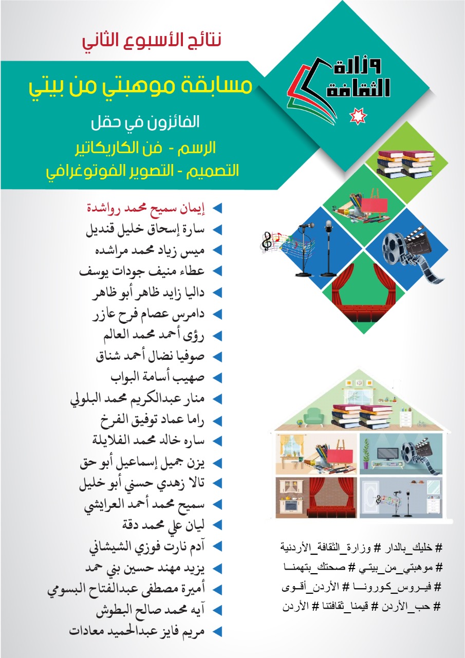 أعلنت وزارة الثقافة أسماء الفائزين في مسابقة "موهبتي من بيتي"للأسبوع الثاني التي أطلقتها الوزارة مؤخرا على موقعها الإلكتروني وشبكات التواصل الاجتماعي. وسط اقبال واسع على المشاركة والتفاعل حيث زادت اعداد المشاركات في الاسبوع الثاني نحو 95 % على اعداد المشاركات في الاسبوع الاول في مختلف حقول المسابقة ومن مختلف المحافظات .