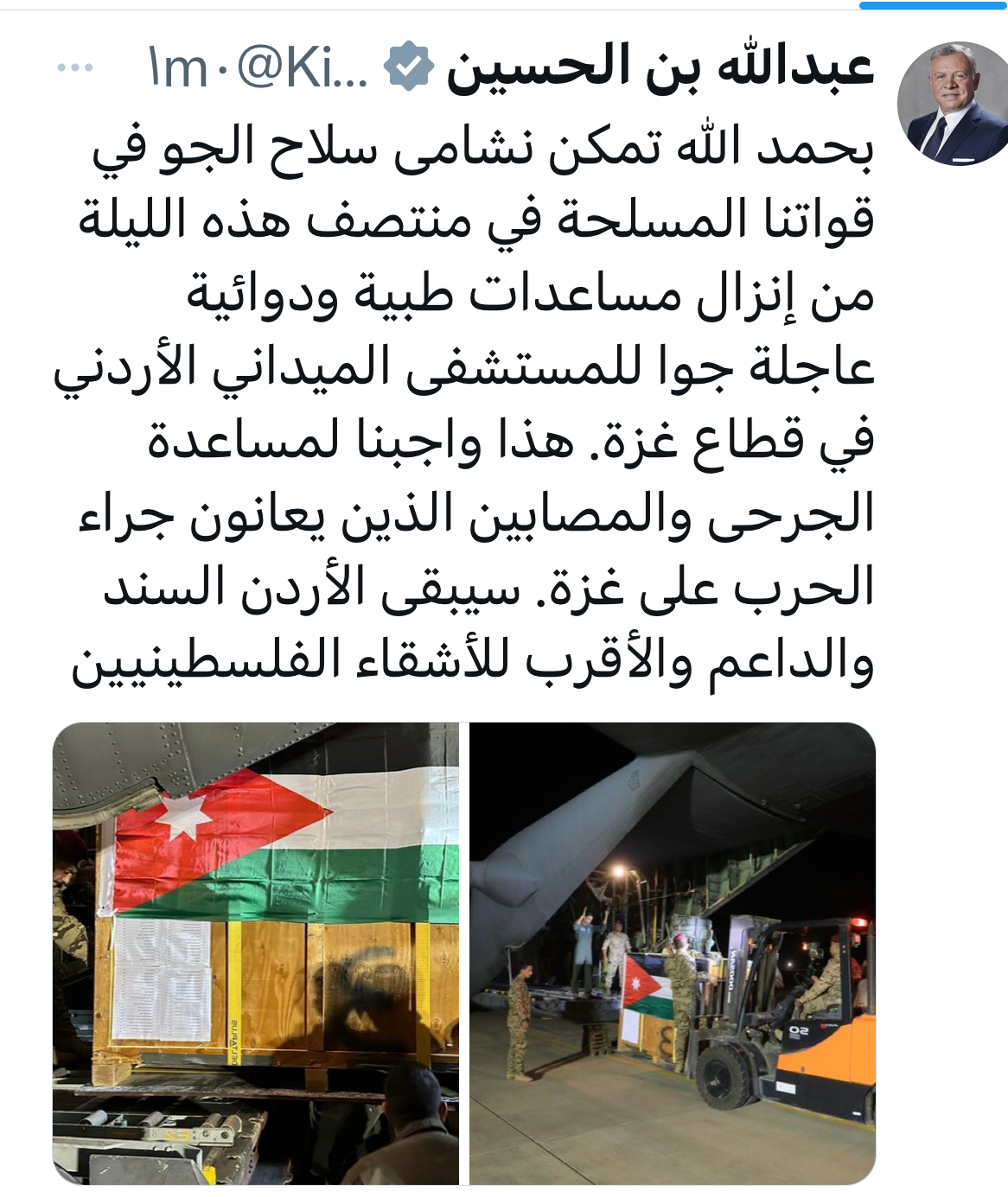 بحمد الله تمكن نشامى سلاح الجو في قواتنا المسلحة في منتصف هذه الليلة من إنزال مساعدات طبية ودوائية عاجلة جوا للمستشفى الميداني الأردني في قطاع غزة. هذا واجبنا لمساعدة الجرحى والمصابين الذين يعانون جراء الحرب على غزة. سيبقى الأردن السند والداعم والأقرب للأشقاء الفلسطينيين