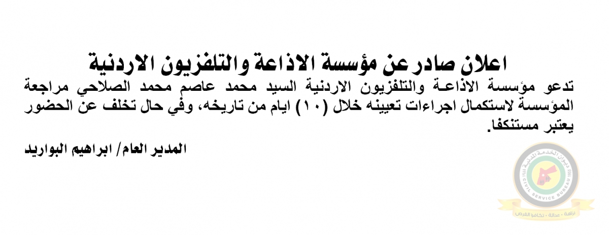 دعت مؤسسة الإذاعة والتلفزيون الأردنية السيد محمد عاصم محمد الصلاحي لمراجعتها وذلك لاستكمال إجراءات تعيينه. وتاليًا التفاصيل في الاعلان المرفق :