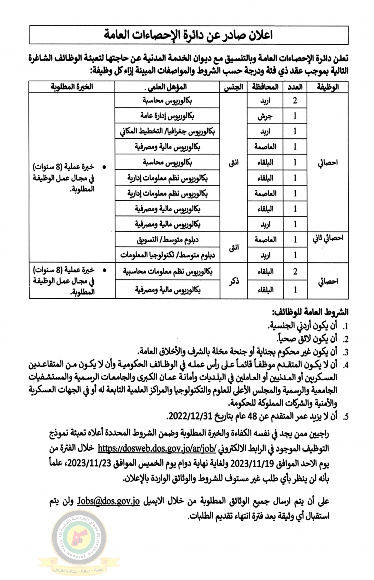 الإحصاءات العامة تعلن حاجتها لتعبئة وظائف شاغرة ..تفاصيل
