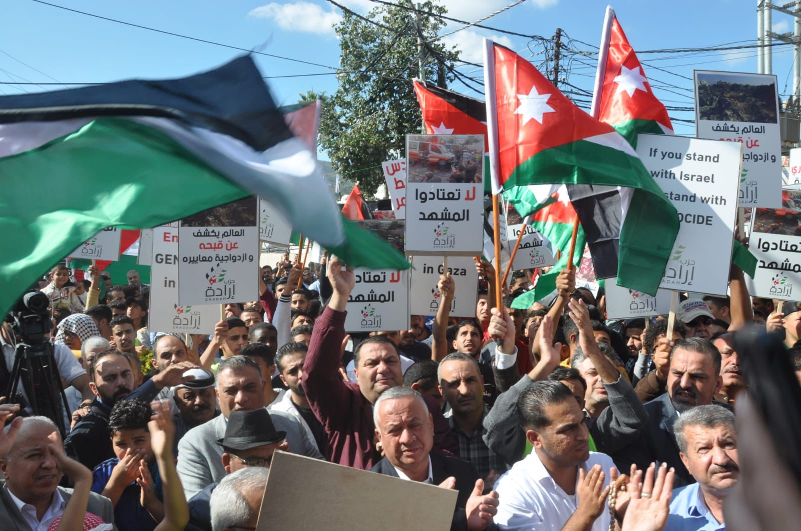 نفذ حزب إرادة والذي يظهر حراكاً نشطاً خلال حرب غزة بعد صلاة الجمعة اليوم في مخيم جرش ( مخيم غزة ) وقفة تضامنية مع الاشقاء الفلسطينيين الذين يواجهون عدواناً مستعراً منذ اكثر من أربعين يوما ً وتأييداً لمواقف الأردن الداعمة للأشقاء والمطالبة بوقف اطلاق النار.وقال الأمين العام لحزب إرادة نضال البطاينة في كلمة له وسط الحشود " لله درك يا غزة التي قطعت عنك كل شرايين الحياة، والموت لإسرائيل الذين يستغلوا الغطاء الغير مسبوق من الولايات المتحدة، وعاشت غزة وفلسطين والأردن حرة ابية.وأضاف ان جلالة الملك قالها اذا تركنا نحن في الأردن وفلسطين وحدنا وها نحن نترك وحيدون لن يهنأ العرب والعالم بالامن والسلام حتى ينال الشعب الفلسطيني حقوقه الكاملة على ترابه .وحيا البطاينة قرارات الأردن بقيادة جلالة الملك بوقف التوقيع على اتفاقية الطاقة مقابل المياه وعدم عودة سفير الكيان الصهيوني وسحب سفيرنا وقرار ارسال مستشفى ميداني الى نابلس الى جانب مستشفى غزة ومركزين للعمليات. وشدد ان فلسطين والأردن وجهان لعملة واحدة واليوم كلنا فلسطينيون لان البوصلة فلسطين وكلنا اردنيون لان الأردن في عين العاصفة.واكد رئيس فرع حزب إرادة في محافظة جرش الباشا محمد فرغل دعم صمود الاشقاء في غزة وفلسطين في مواجهة هذا العدوان المستمر بكل ما نستطيع متعهداً امام الله اننا مستعدون ان نضحي بارواحنا من اجل الأردن وفلسطين مستنكرا جرائم الإبادة الجماعية ضد الاهل في غزة والمواقف الغربية الداعمة للعدوان على غزة.ودعا الى الوقوف الى صف الموقف الأردني الداعم للاشقاء بقيادة جلالة الملك عبدالله الثاني المعظم للتخفيف عن الاشقاء ووقف العدوان الصهيومي مشددا أهمية تقديم كل اشكال الدعم للاشقاء في غزة بكل ما نستطيع.وحيا رئيس المجلس الوطني لحزب إرادة خميس عطية صمود غزة بشيوخها واطفالها ونسائها واطفالها ورجاله ومقاومتها الصامدة وشهدائها وجرحاها الذين علمونا معنى التضحية والفداء والصبر على الشدائد فغزة اليوم تعاني بفعل آلة الاجرام الصهيوني المدعومة أمريكيا فالادارة الامريكية شريكة بالعدوان على اطفال ونساء غزة ومستشفيات غزة . وأضاف ان غزة اسقطت الانسانية والادعاءات الغربية بحقوق الانسان والقانون الدولي، داعيا الى محاكمة قادة الصهاينة امام محكمة الجنايات الدولية، مؤكدا ان حضور هذه الحشود هذه الفعالية دعما للاهل في غزة فنحن مع غزة ولا نتضامن معم فقط بل نحن في خندق غزة ضد الصهاينة ولن نتركها وحيدة ونصرتها واجب ديني. ووجهت النائب فايزة عضيبات التحية لصمود الاشقاء في قطاع غزة في مواجهة العدوان الصهيوني مشددة اننا في الأردن بقيادة جلالة الملك ندعم الاشقاء بكل اشكال الدعم ونقدم ارواحنا رخيصة فداء للاردن وفلسطين.وقال عضو المجلس المركزي في حزب إرادة النائب محمد الظهراوي اننا منتصرون فخلال اكثر من أربعين يوما والشهداء يرتقون مشددا ان غزة كشفت من معنا ومن ضدنا وسنبقى في الأردن بقيادة جلالة الملك عبدالله الثاني الداعمين لفلسطين وصمودها .واستنكر المواقف الغربية الداعمة للعدوان الصهيوني والتي كشفها العدوان على غزة بان حقوق الانسان كذبة غربية.وعبر الشاب سيف بني مصطفى باسم ملتقى شباب جرش عن دعمه للموقف الأردني الداعم والمساند للاشقاء في فلسطين مستنكرا العدوان المتواصل على الاشقاء الذي استهدف الأطفال والنساء والمدنيين وكل شيئ في غزة.واكد الدكتور راكز الحباشنة دعم صمود الاشقاء في غزة والمطالبة بوقف العدوان الغاشم الذي يستهدف الأطفال والنساء، مؤكدا ان الأردن بكل مدنه وقراه وبواديه مع فلسطين وقضيتها العادلة.وردد المشاركون شعارات وهتافات مناصرة للاشقاء وصمودهم وتحيي الموقف الأردني الداعم لهم ومنها:علو الصوت يا شباب أمريكا راس الإرهاببايدن يا كذاب انت الداعم للارهاب وحدتنا هي الأساس نسقي العدا مر الكاس حلفاء إسرائيل يتحملون مسؤولية جرائم الكيان الهمجياستهداف الأطفال والمدنيين جرائم حربالوقف الفوري لحرب الإبادة الجما