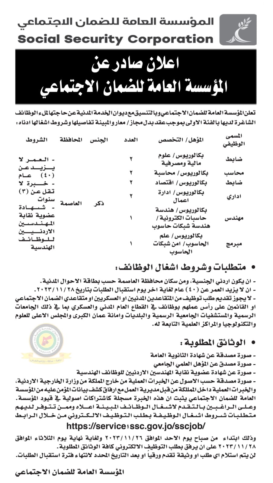 الضمان الاجتماعي تعلن حاجتها لملء وظائف شاغرة لديها بالفئة الاولى ..تفاصيل