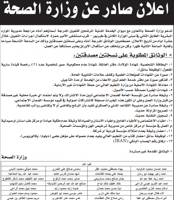 الصحة تدعو مرشحين لاستكمال اجراءات التعيين (أسماء)