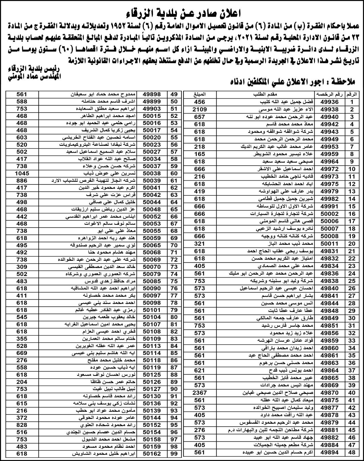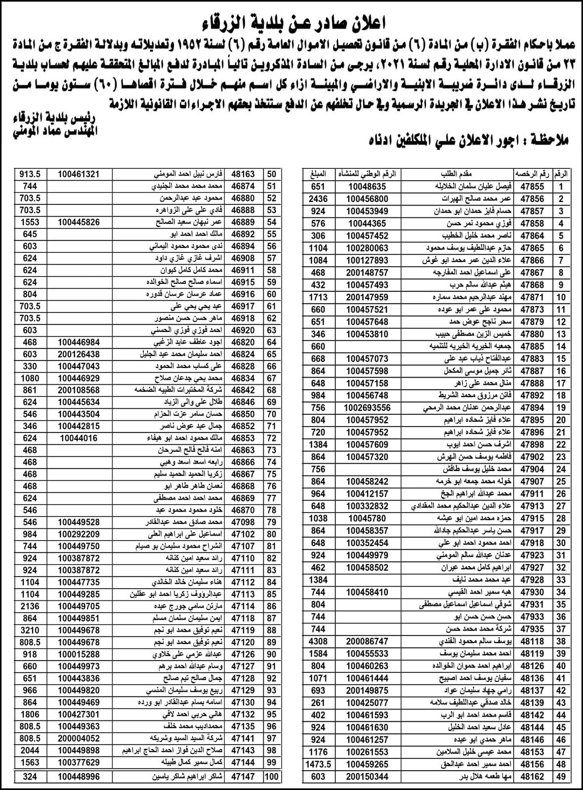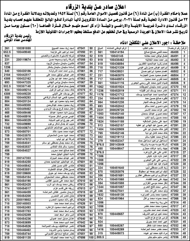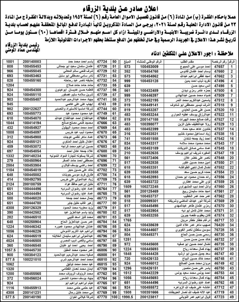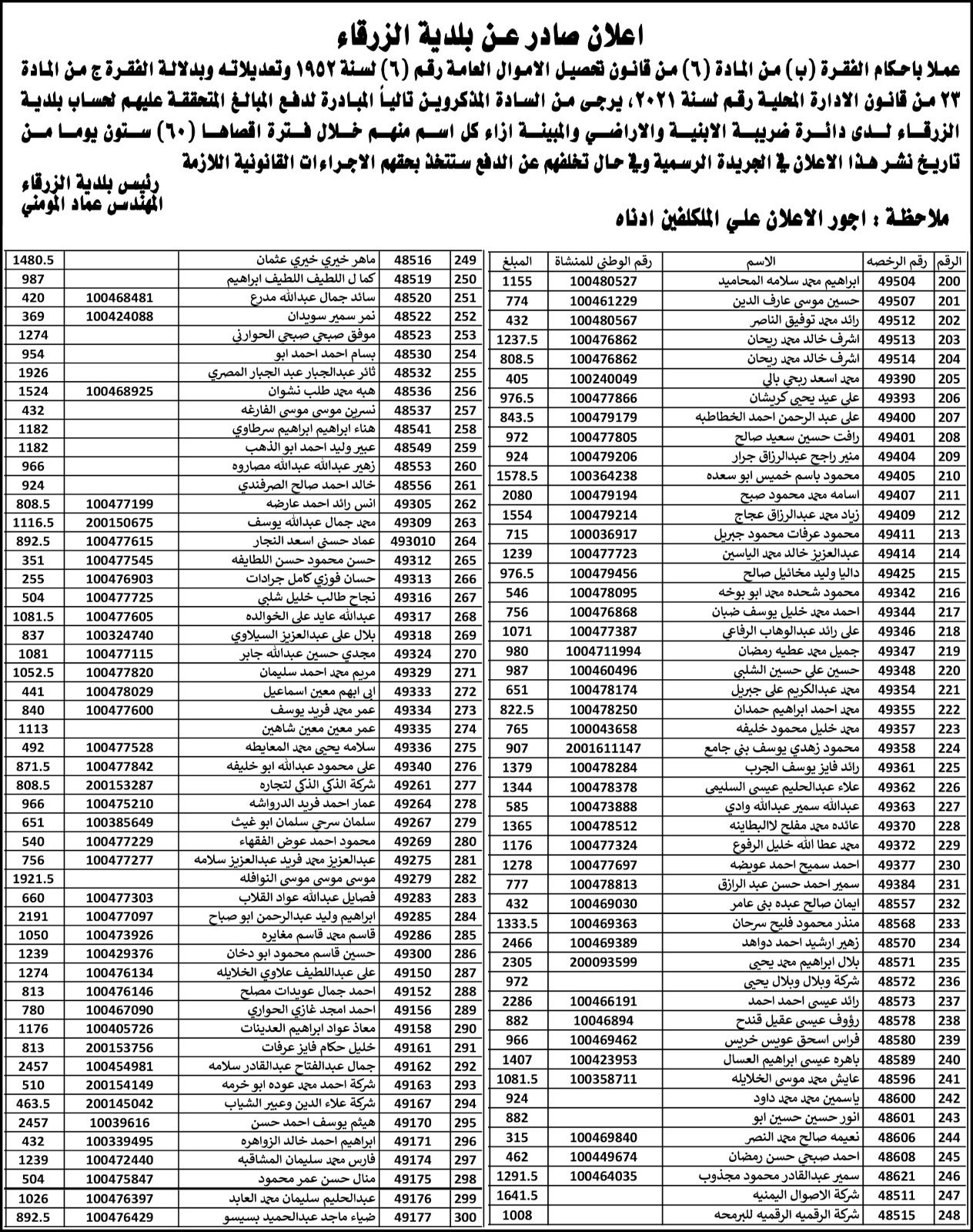 نشرت بلدية الزرقاء دفعة من اسماء الأشخاص المتخلفين عن دفع الضرائب لصالح البلدية