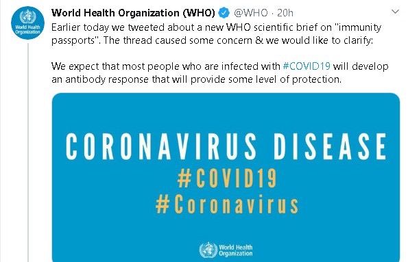 ونوهت الصحة العالمية أنها ستقوم بتحديث بيانها عن جوازات المناعه مع توفر أدلة جديدة كما انها ستحذف بيانها عن صفحتها عن تويتر لتجنب مزيد من اللغط حول الموضوع.