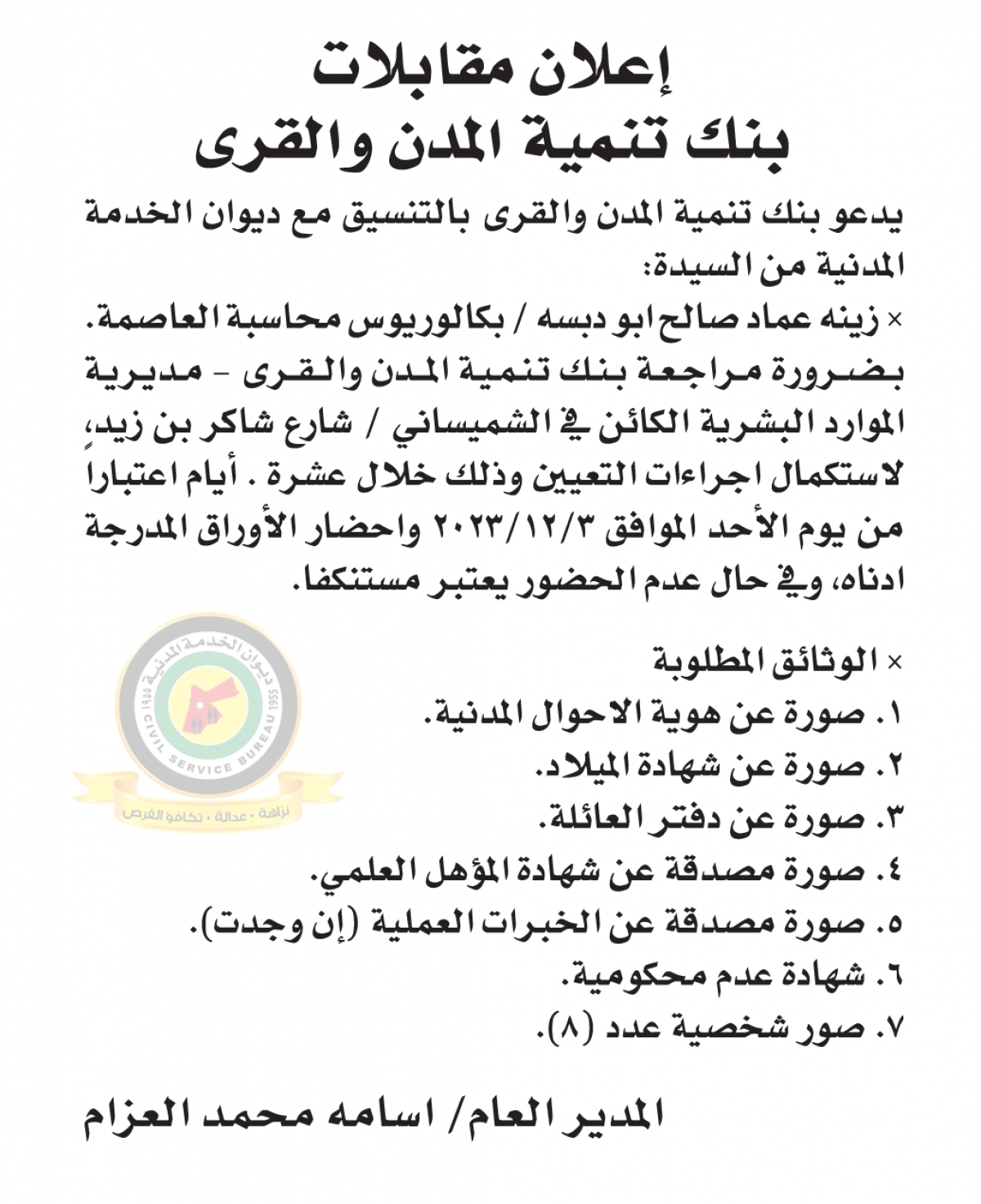 دعا بنك تنمية المدن والقرى بالتنسيق مع ديوان الخدمة المدنية مرشحة لاستكمال إجراءات تعيينها.