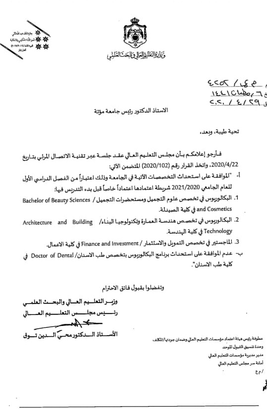 وافق مجلس التعليم العالي ،في جلستة التي عقدها عبر تقنية الاتصال المرئي ،بالموافقة على استحداث التخصصات التالية في جامعة مؤتة ،وذلك اعتبارا من الفصل الدراسي الاول للعام الجامعي 2020/2021 .