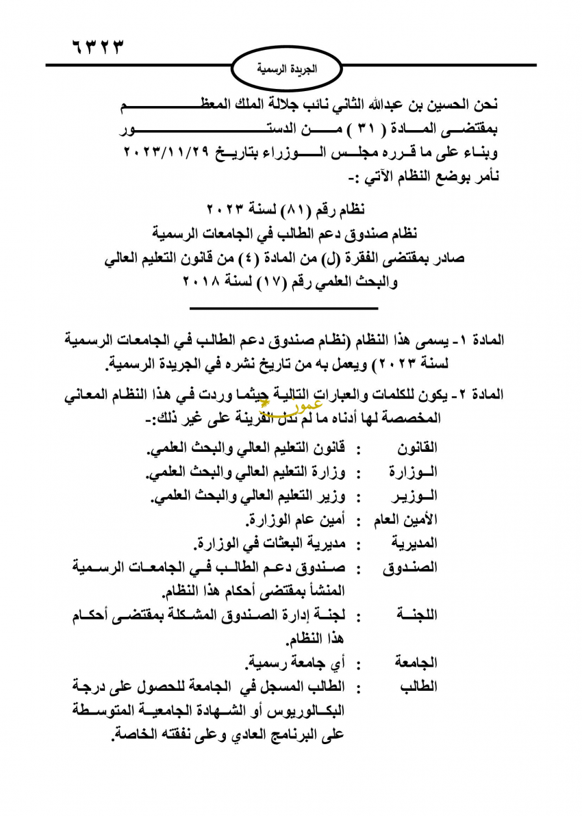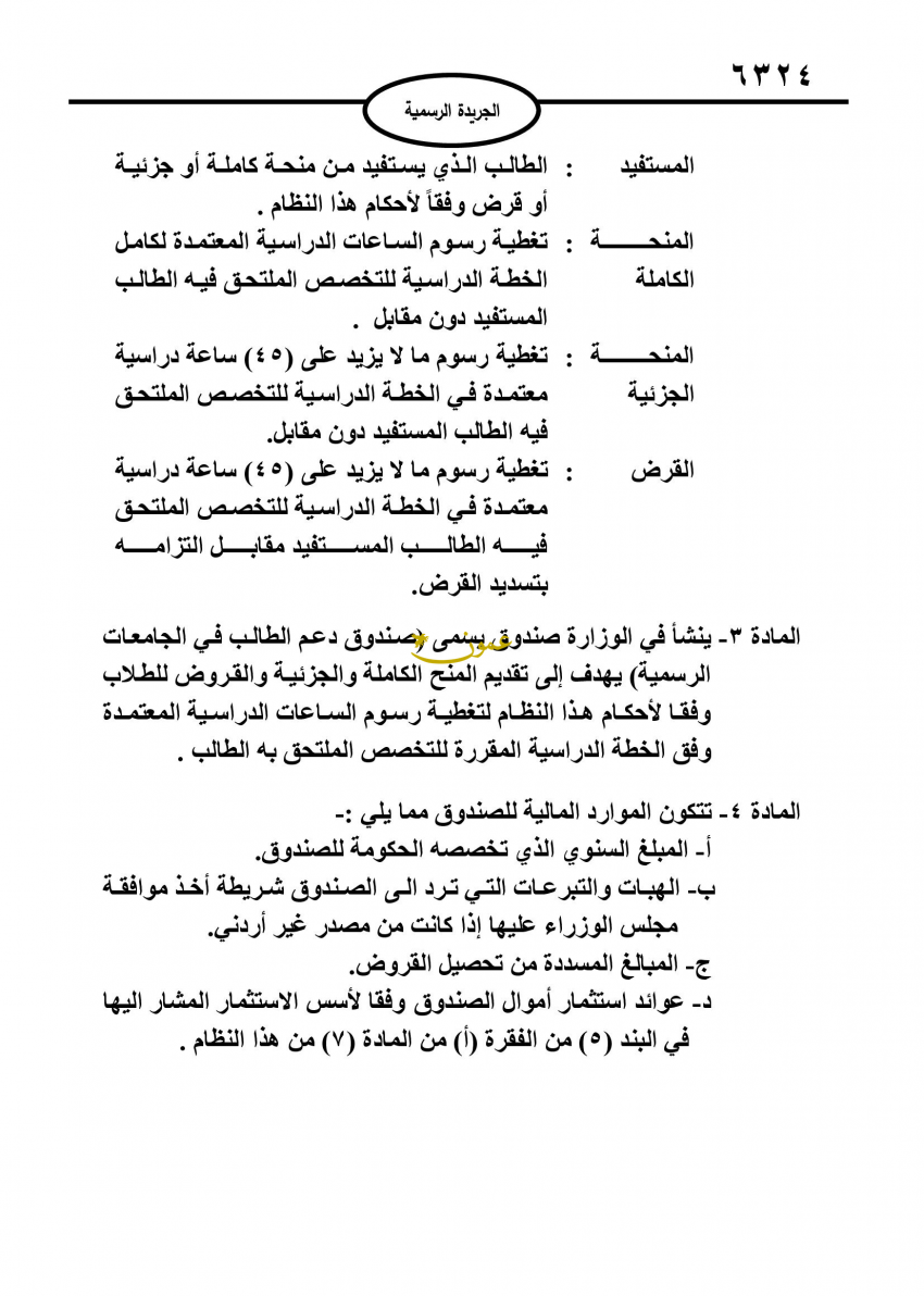 حرمت الحكومة، الطلبة في الجامعات الرسمية، الحاصلين على معدل أقل من 68 بالمئة، من الاستفادة من المنح والقروض الجامعية. وبحسب النظام الجديد، والذي نشرته في الجريدة الرسمية واطلعت عليه عمون، فإن الحكومة قامت بتعديل شروط الاستفادة من دعم صندوق الطالب، بحيث أن لا يقل معدل الطالب التراكمي في الفصل السابق لتاريخ تقديم طلب الاستفادة من المنحة أو القرض 2.5 من 4 نقاط أو عن 68 بالمئة أو عن تقدير جيد، في حين كان في السابق لا يقل معدل الطالب التراكمي عن 60 بالمئة أو عن نقطتين من أصل 4 نقاط. واشترطت الحكومة، ان يكون الطالب مسجلًا في الجامعة لدرجة البكالوريوس أو الشهادة الجامعية المتوسطة على البرنامج العادي وعلى نفقته الخاصة. وكما حرمت الطلبة الحاصلين على عقوبة الإنذار التأديبي في الجامعات فأعلى من التقدم بالطلب للاستفادة من الصندوق، في حين كانت في السابق تحرم من صدرت بحقه عقوبة تجاوزت الإنذار.