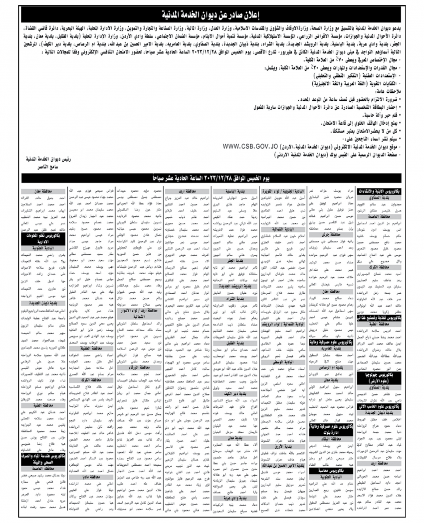 دعا ديوان الخدمة المدنية بالتنسيق مع 15 جهة حكومية، مرشحين لحضور الامتحان التنافسي الإلكتروني. وبحسب الإعلان المنشور عبر الصحف اليومية، فإن الجهات تشمل وزارة الصحة، وزارة الأوقاف والمقدسات الإسلامية، وزارة العدل، وزارة المالية، وزارة الصناعة والتجارة والتموين، وزارة الإدارة المحلية، الهيئة البحرية، ودائرة قاضي القضاة، دائرة الأحوال المدنية والجوازات، مؤسسة الإقراض الزراعي، المؤسسة الاستهلاكية المدنية، مؤسسة تنمية أموال الأيتام، مؤسسة الضمان الاجتماعي، سلطة وادي الأردن، بالإضافة إلى بلديات. وسيكون الامتحان في مجال الاختصاص المعرفي ويعطى 70 بالمئة من العلامة الكلية، ومجال القدرات والاستعدادات والمهارات ويعطى 30 بالمئة. وتاليًا الأسماء: