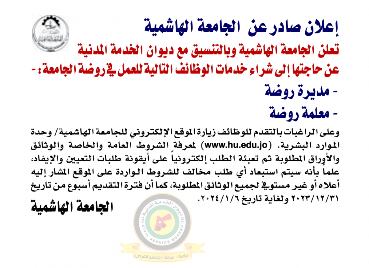 أعلنت الجامعة الهاشمية وبالتنسيق مع ديوان الخدمة المدنية عن حاجتها لشراء خدمات وظائف . وتاليًا التفاصيل في الاعلان المرفق :