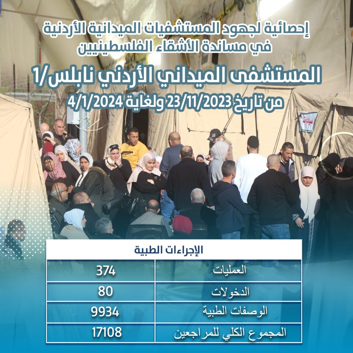 نشرت القيادة العامة للقوات المسلحة – الجيش العربي إحصائية لجهود المستشفيين الميدانيين الأردنيين "الخاص/2″ جنوب قطاع غزة و"نابلس/1" في مساندة الأشقاء الفلسطينيين. وذكرت أن المستشفى الميداني الأردني الخاص/2 جنوب قطاع غزة، من تاريخ 29/11/2023 ولغاية 3/1/2024، استقبل 29844 مراجعا، أدخل منهم 396 مريضا، كما أجرى 4392 عملية جراحية. وبينت أن المستشفى الميداني الأردني نابلس/1، من تاريخ 23/11/2023 ولغاية 4/1/2024، استقبل 17108 مراجعين، أدخل منهم 80 مريضا، كما أجرى 374 عملية جراحية، وصرف 9934 وصفة طبية.