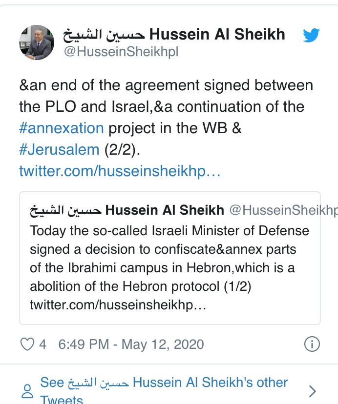 وفي تغريدة على” تويتر” قال الشيخ: “اليوم وقع ما يسمى وزير الدفاع الإسرائيلي (نفتالي بينيت) قرارا بمصادرة وضم أجزاء من الحرم الإبراهيمي في الخليل، مما يعد إلغاء لبروتوكول الخليل، وإنهاء للاتفاق الموقع بين منظمة التحرير وإسرائيل”.