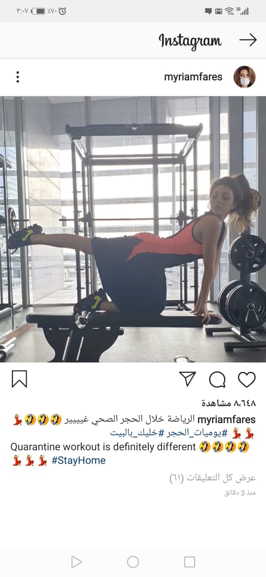 وشاركت ميريام فارس صورها من المنزل عبر حسابها على انستجرام وهي تُمارس طقوس الحجر وطالبت الجميع بأن يبقوا بالبيت .
