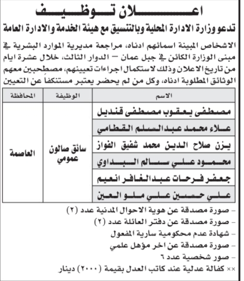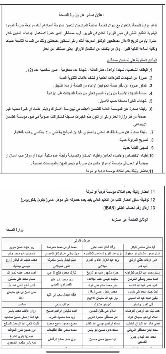 دعا ديوان الخدمة المدنية بالتعاون مع وزارات ومؤسسات حكومية، التالية اسماؤهم لإجراء المقابلات الشخصية لغايات استكمال اجراءات التعيين.