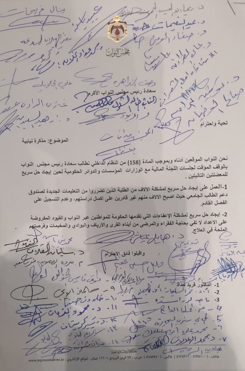 ودعا النواب إلى العمل على إيجاد حل سريع لمشكلة الآلاف من الطلبة الذين تضرروا من التعليمات الجديدة لصندوق دعم الطالب الجامعي، موضحين أن أغلب الطلاب أصبحوا غير قادرين على إكمال دراستهم وعدم التسجيل على الفصل المقبل.