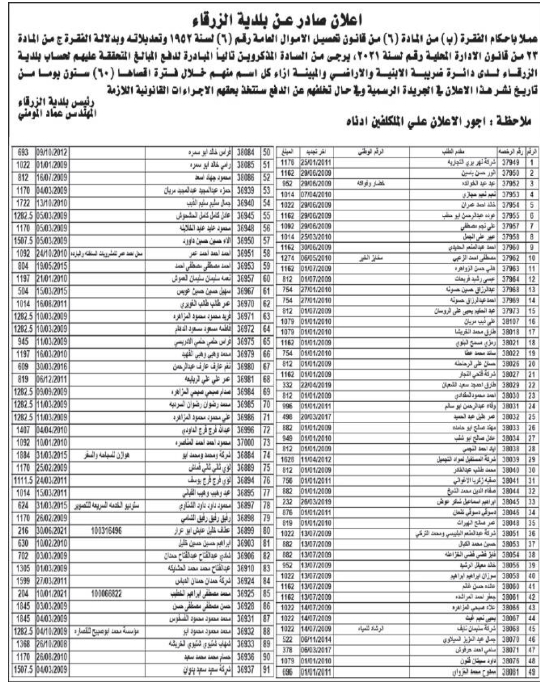 دعت بلدية الزرقاء اليوم الاحد المذكورين تاليا الى المبادرة لدفع المبالغ المتحققة عليهم لحساب البلدية لدى دائرة ضريبة الابنية والاراضي والمبينة ازاء كل اسم منهم خلال فترة اقصاها ستون يوما من تاريخ نشر هذا الاعلان في الجريدة الرسمية وفي حال تخلفهم عن الدفع ستتخذ بحقهم الاجراءات القانونية اللازمة.وتاليا الاسماء: