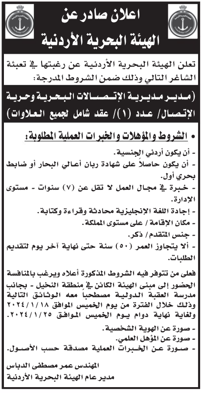 أعلنت الهيئة البحرية الأردنية عن رغبتها في تعبئة شاغر مدير مديرية الاتصالات البحرية وحرية الإتصال وذلك ضمن الشروط المدرجة أدناه