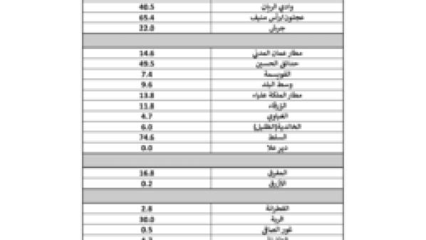 وبحسب الكشف الصادر عن دائرة الأرصاد الجوية لم تسجل محافظة العقبة والجفرر والبتراء ومعان اي كميات تذكر . وتالياً كميات الأمطار الهاطلة على المملكة خلال الـ 48 ساعة الماضية .