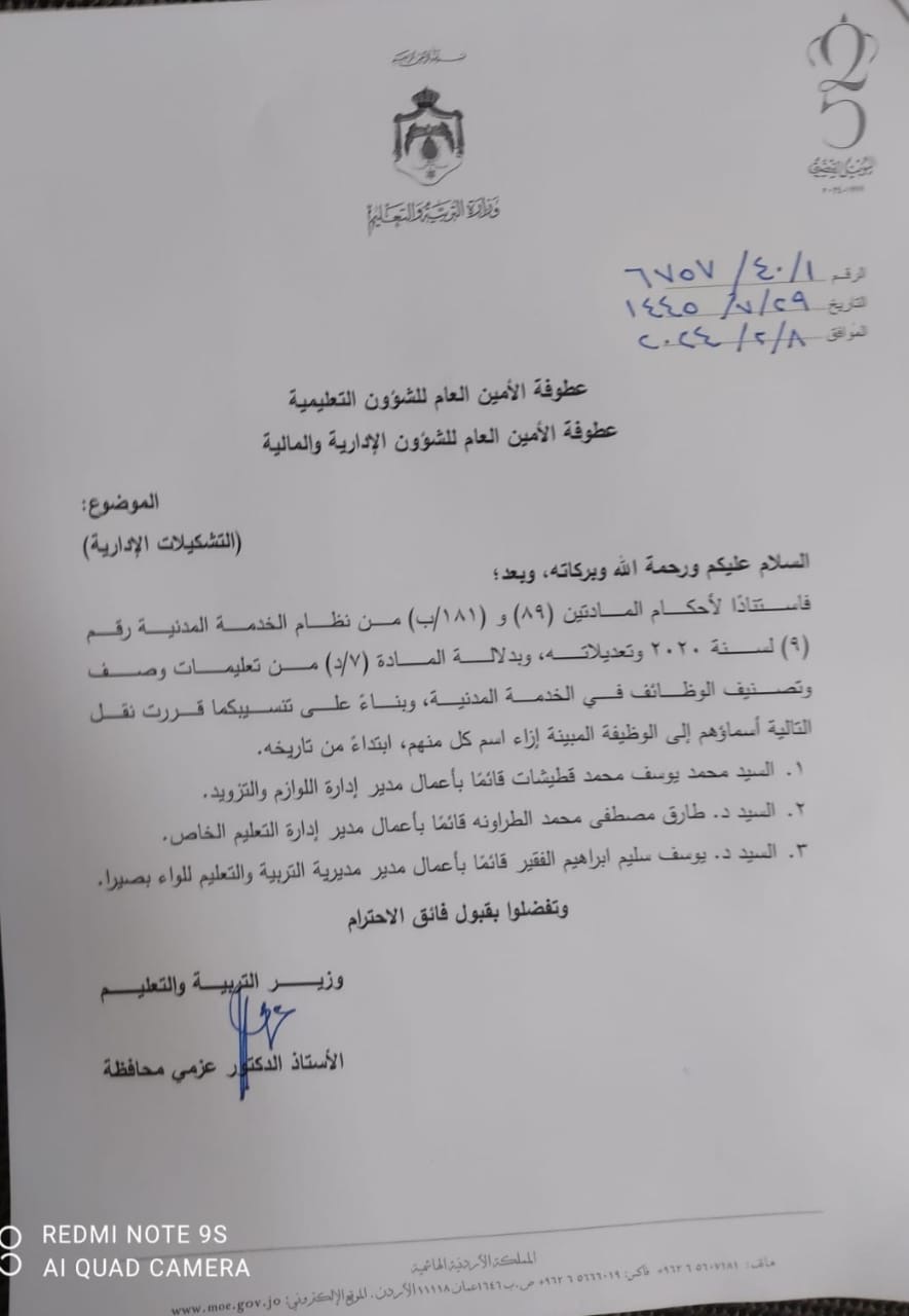 قرر وزير التربية والتعليم والتعليم العالي والبحث العلمي الأستاذ الدكتور عزمي محافظة اجراء التشكيلات الإدارية التالية :-