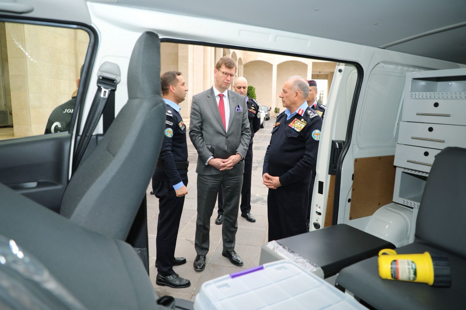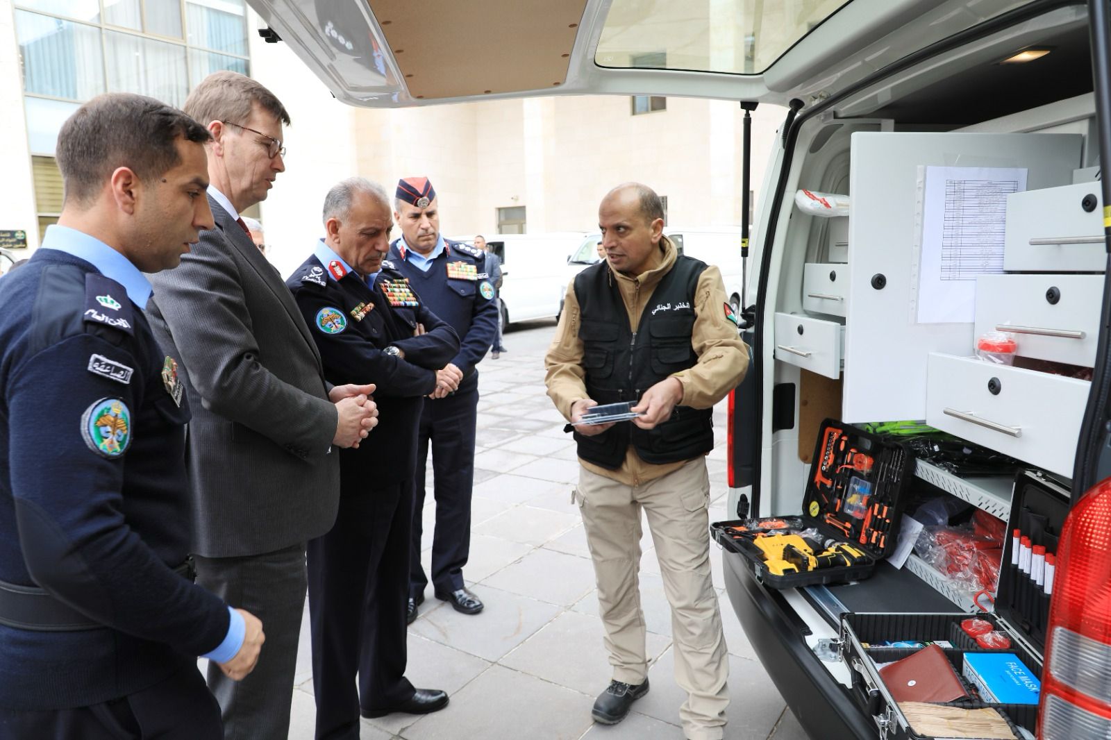 وعلى هامش اللقاء شهد مدير الأمن العام والسفير الألماني، تسليم ستة آليات مقدمة من الحكومة الألمانية، وقيادة الشرطة الفدرالية، إلى مديرية الأمن العام، مجهّزة بالمعدات والتقنيات الحديثة اللازمة للعمل مع مفارز مسارح الجريمة في إدارة المختبرات والأدلة الجرمية .
