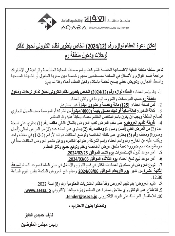 طرحت سلطة منطقة العقبة الاقتصادية الخاصة، اليوم الأربعاء، العطاء الخاص بتطوير نظام إلكتروني لحجز تذاكر لرحلات ودخول منطقة رم. ودعت في إعلان نشر في الصحف اليومية، الشركات والمؤسسات المحلية المختصة والراغبة في الاشتراك إلى مراجعة قسم اللوازم والأشغال في السلطة. وتاليا التفاصيل: