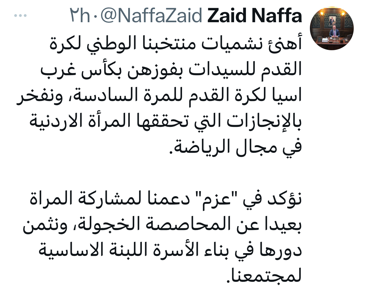 أهنئ نشميات منتخبنا الوطني لكرة القدم للسيدات بفوزهن بكأس غرب اسيا لكرة القدم للمرة السادسة، ونفخر بالإنجازات التي تحققها المرأة الاردنية في مجال الرياضة.