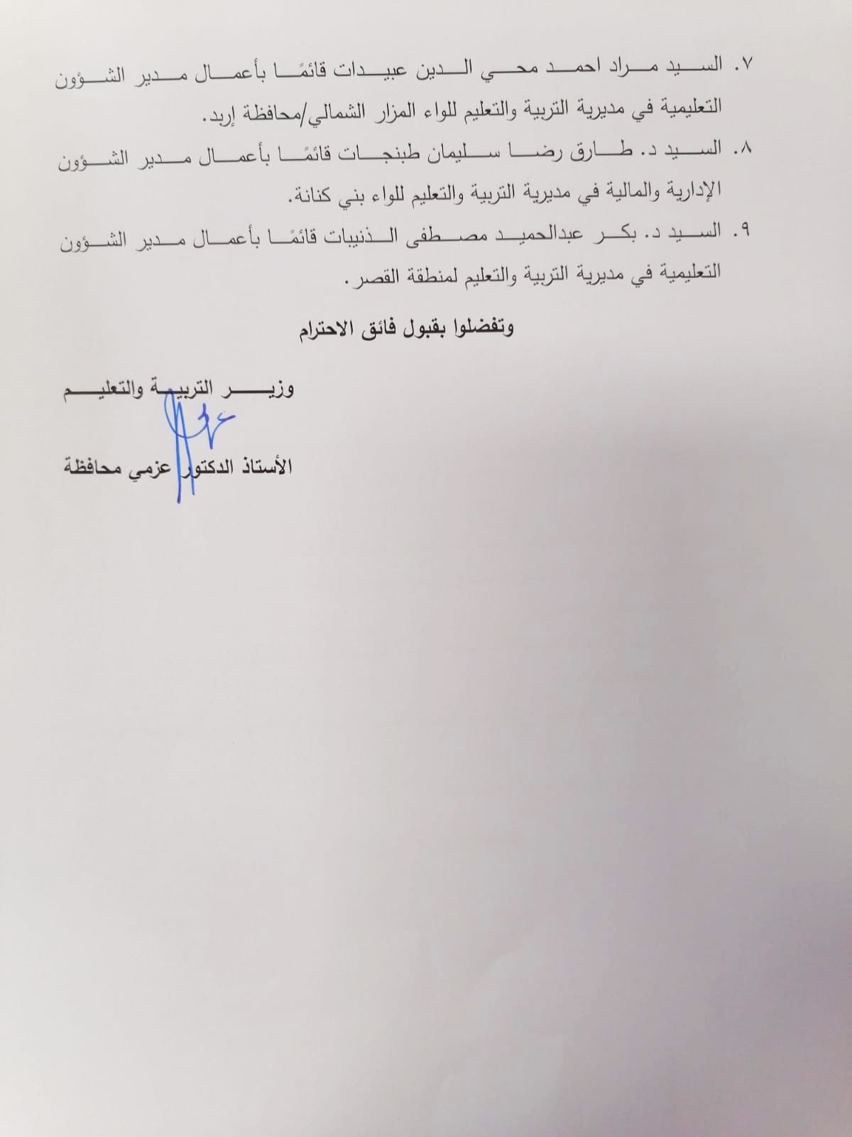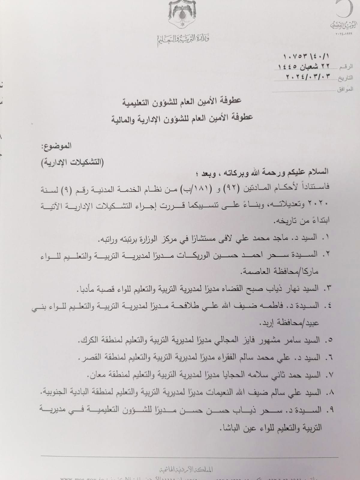 أجرى وزير التربية والتعليم الأستاذ الدكتور عزمي محافظة تشكيلات إدارية واسعة في الوزارة شملت مركز الوزارة والمديريات، ومدراء تربية ومدراء مختصين.