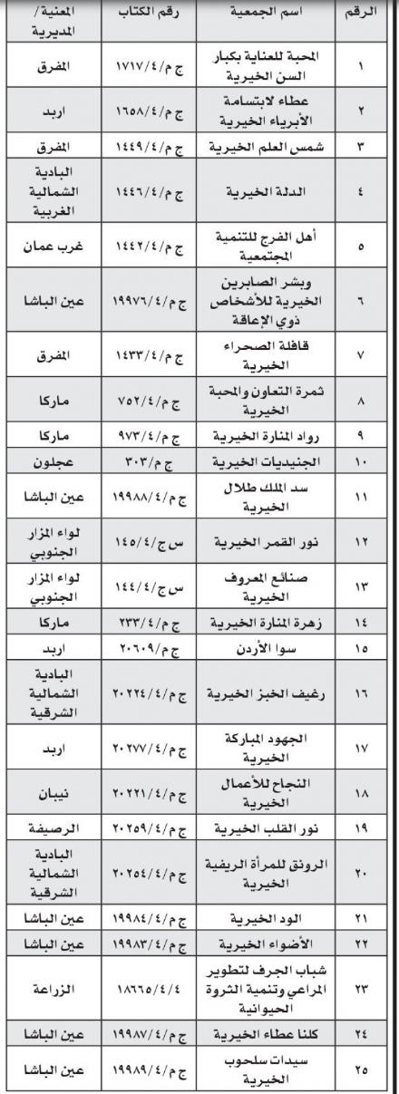 أعلنت وزارة التنمية الاجتماعية، اليوم الأحد، حلّ عددد من الجمعيات الخيرية في المملكة.جاء ذلك استناداً لأحكام المادة 11/ب من النظام المحدد لأحكام الأنظمة الأساسية للجمعيات رقم 57 لسنة 2010.ودعت وزارة التنمية، الدائنين والمدينين الذين لهم حقوق أو عليهم التزامات للجمعيات أناه مراجعة لجنة حلّ الجمعية المبينة إزاء كل جمعية خلال شهر من تاريخه.وتالياً أسماء الجمعيات المُنحلة