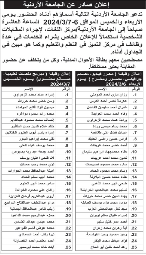 دعت الجامعة الأردنية 50 شخصاً لإجراء المقابلات الشخصية يومي الأربعاء والخميس الساعة العاشرة صباحاً في مركز اللغات لإستكمال شراء خدمات في عدة وظائف في مركز التميز في التعلم والتعليم وكما هو مبين في الجدول أدناه .